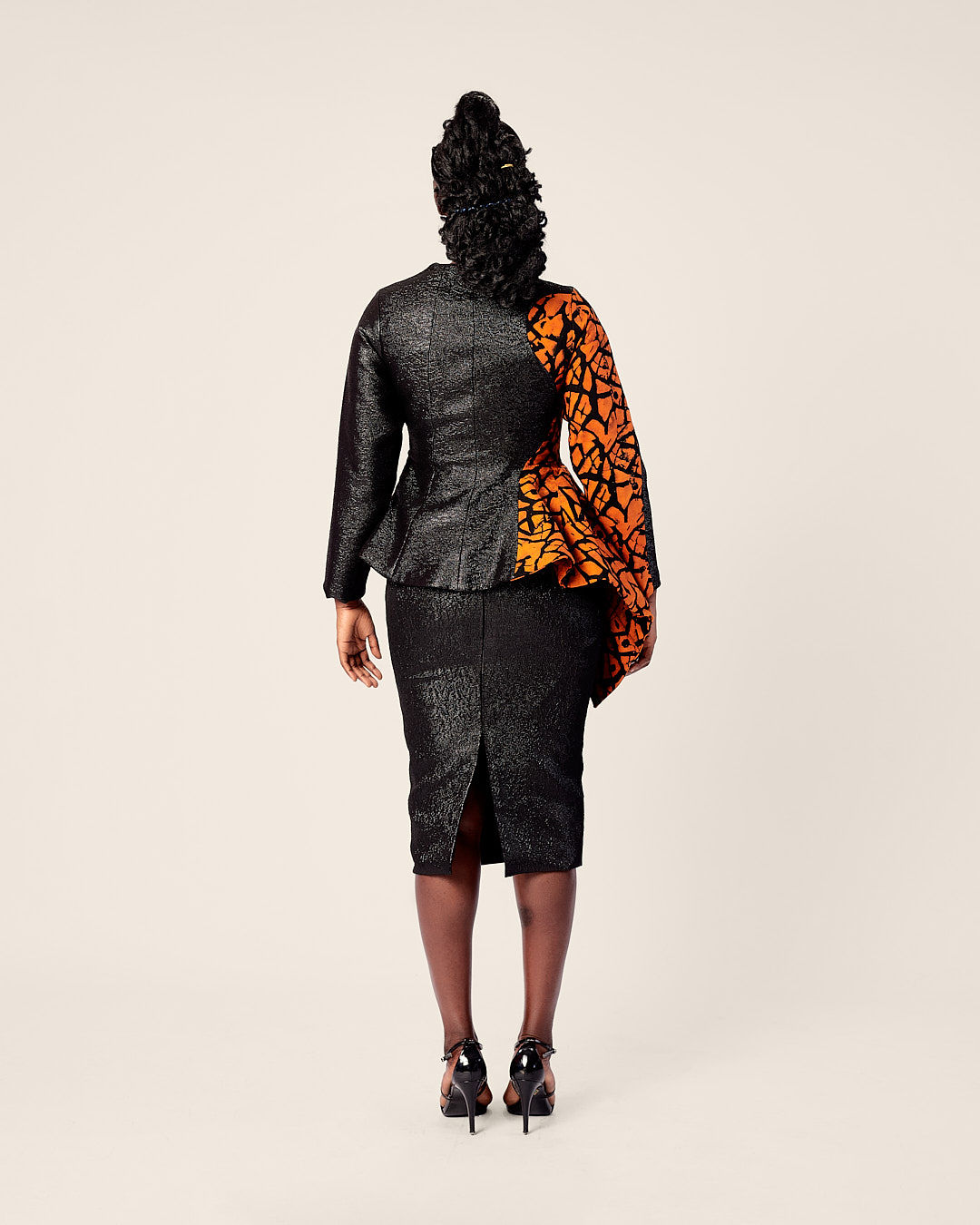 An asymmetrical jacket featuring a uniquely prominent batik inset, flawlessly complemented by our classic midi pencil skirt. This set is the epitome of versatility and timelessness, making it an essential addition to your wardrobe.