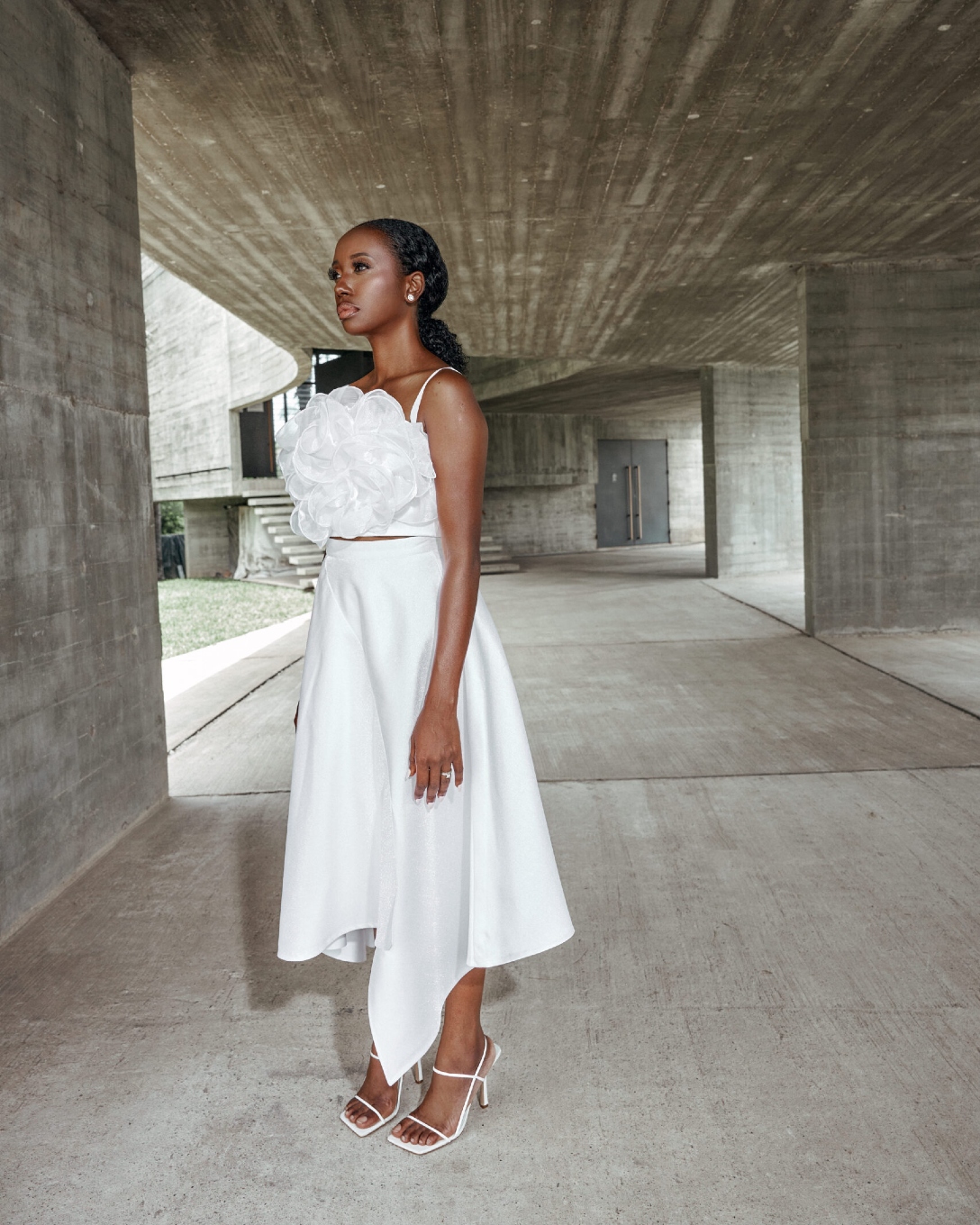 A strapped crop top with detailed ruffles of cherry organza creating a beautiful fullness paired with an overlapped asymmetric flare skirt .