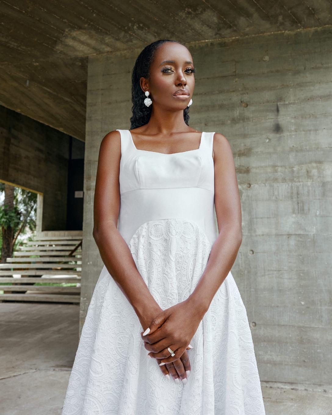 The structured sleeveless bodice of the hessi dress merges just at the right angle allowing the rich cotton lace bottom to flow with ease .