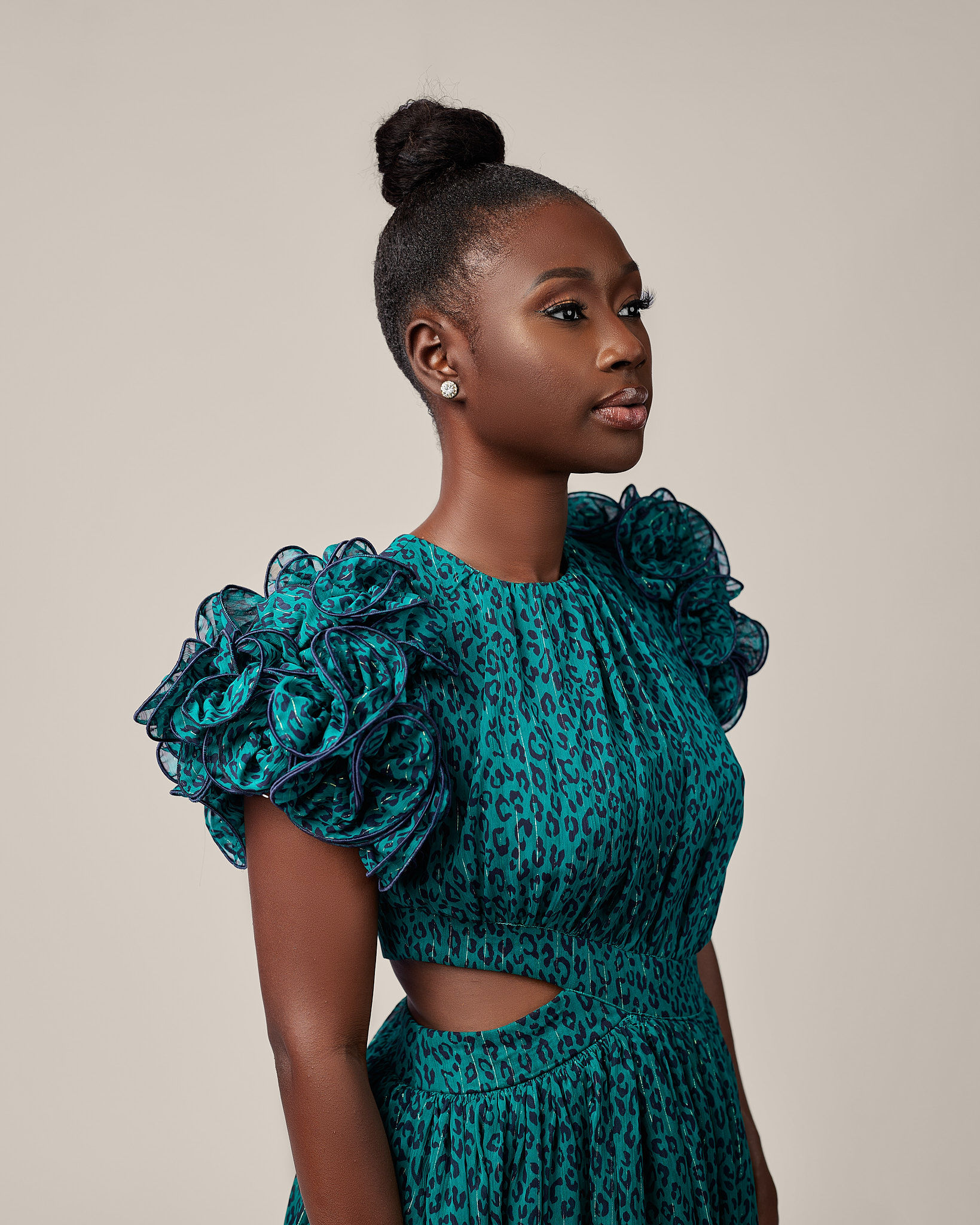 This dress features a gathered top that adds a flattering texture to the bodice as the dress cascades down.It has stylish side cutouts that reveal a hint of skin, adding an alluring touch to the design. And finally to complete the look is a detailed ruffled sleeve to complete the look.