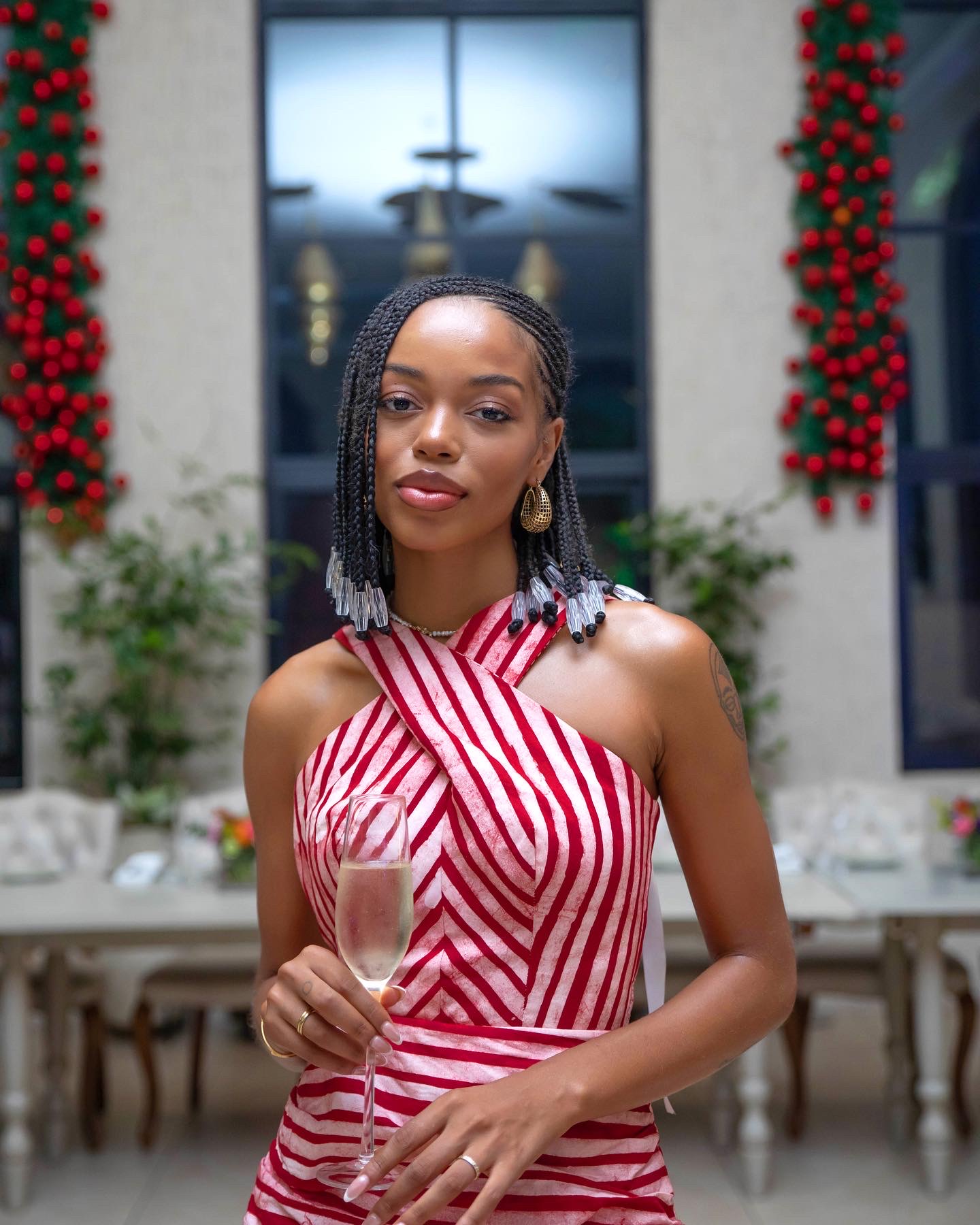 This halter neck dress features a stylish chevron-striped design on the bodice, adding a dynamic touch. The mid skirt is elegantly ruched, enhancing the waistline, while the tiered bottom creates a flowing and graceful silhouette.