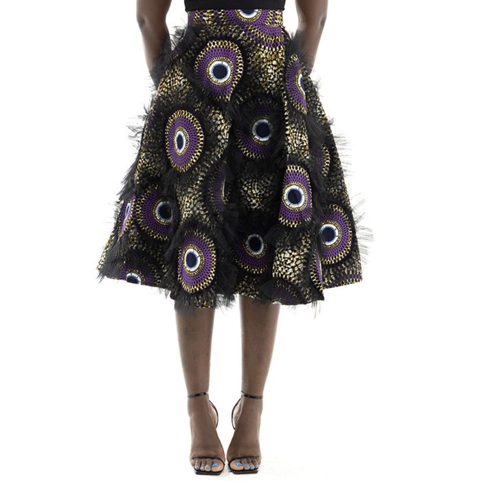 The Disc Print skirt will definitely turn heads. The gathered tulle effect around each motif creates an alluring 3D effect.