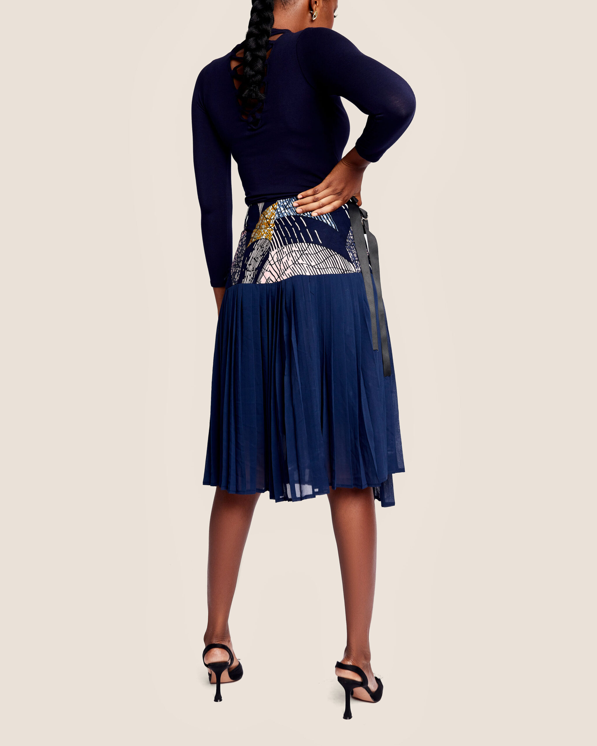 Paired with an asymmetric tye dye print and pleated chiffon skirt. The chiffon adds a delicate and airy quality to the skirt.