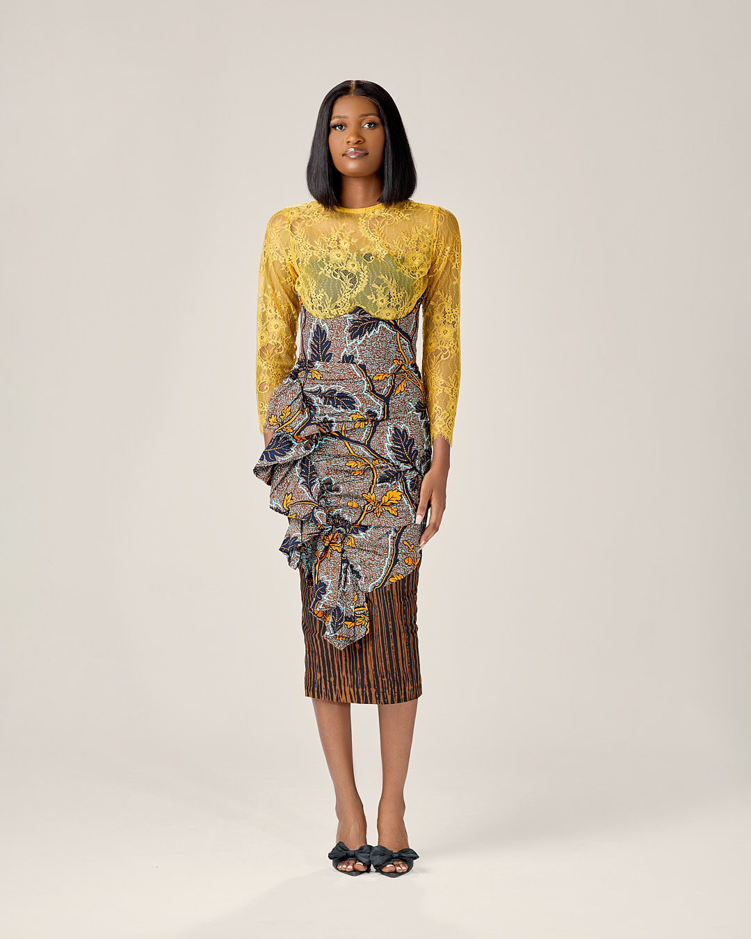 An asymmetrical jacket featuring a uniquely prominent batik inset, flawlessly complemented by our classic midi pencil skirt. This set is the epitome of versatility and timelessness, making it an essential addition to your wardrobe.