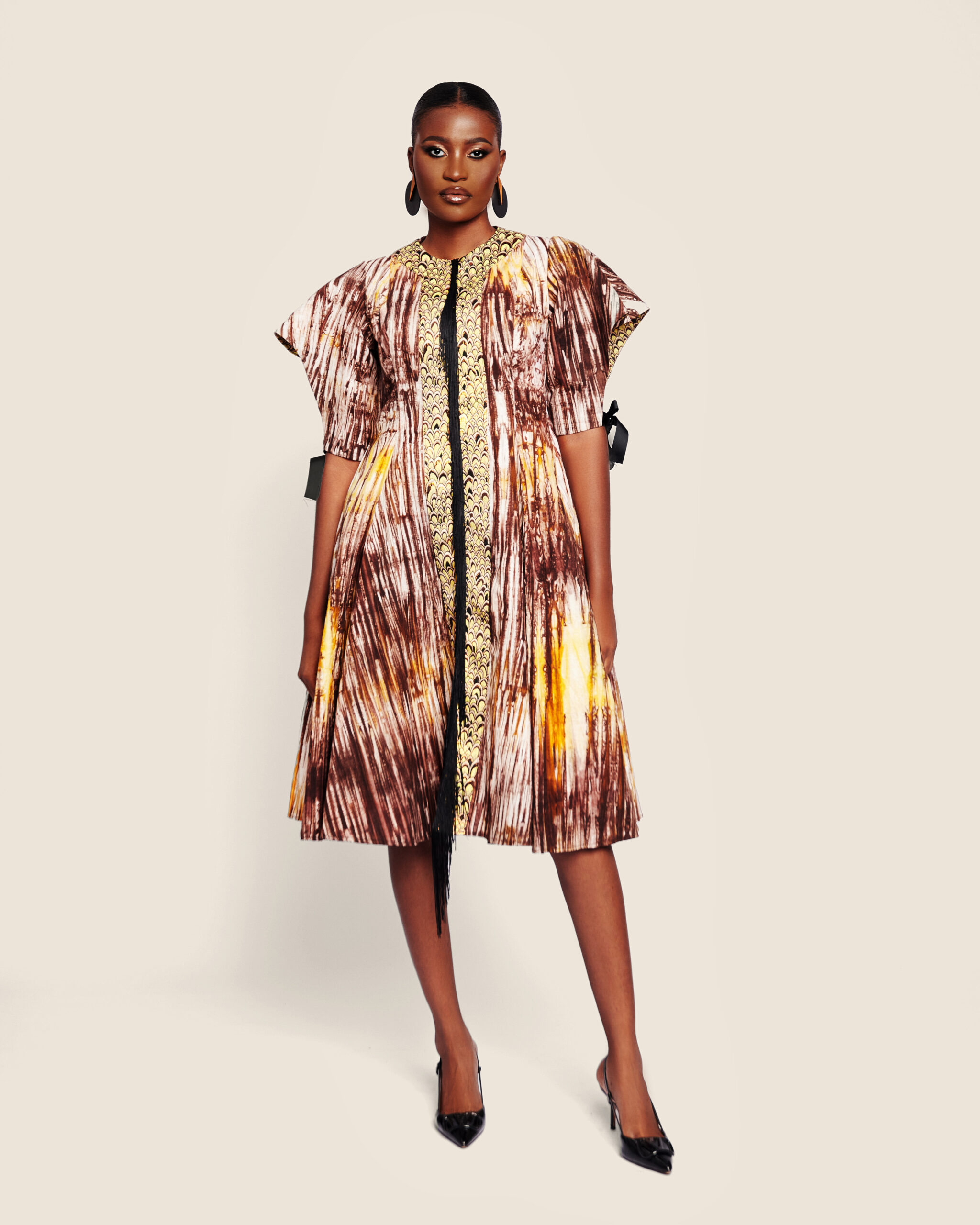 Fugu is a traditional cloth that originates from the northern part of Ghana; often stripped and used to make local garments . Our inspiration for this tye dye dress draws inspiration from that.