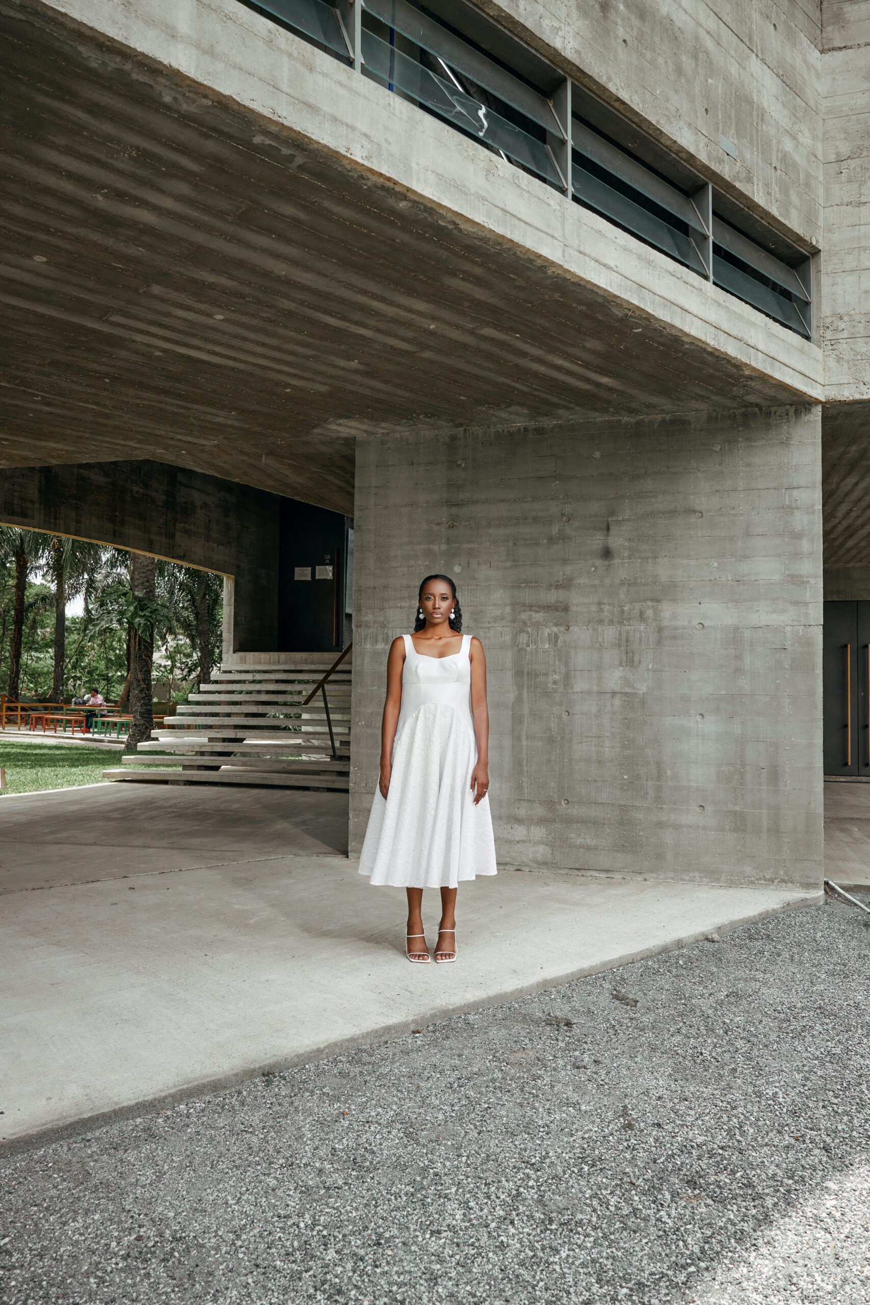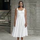The structured sleeveless bodice of the hessi dress merges just at the right angle allowing the rich cotton lace bottom to flow with ease .