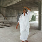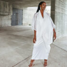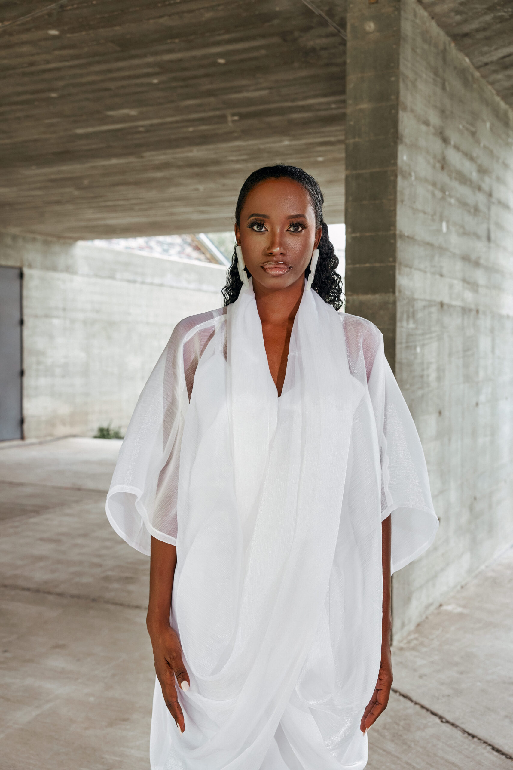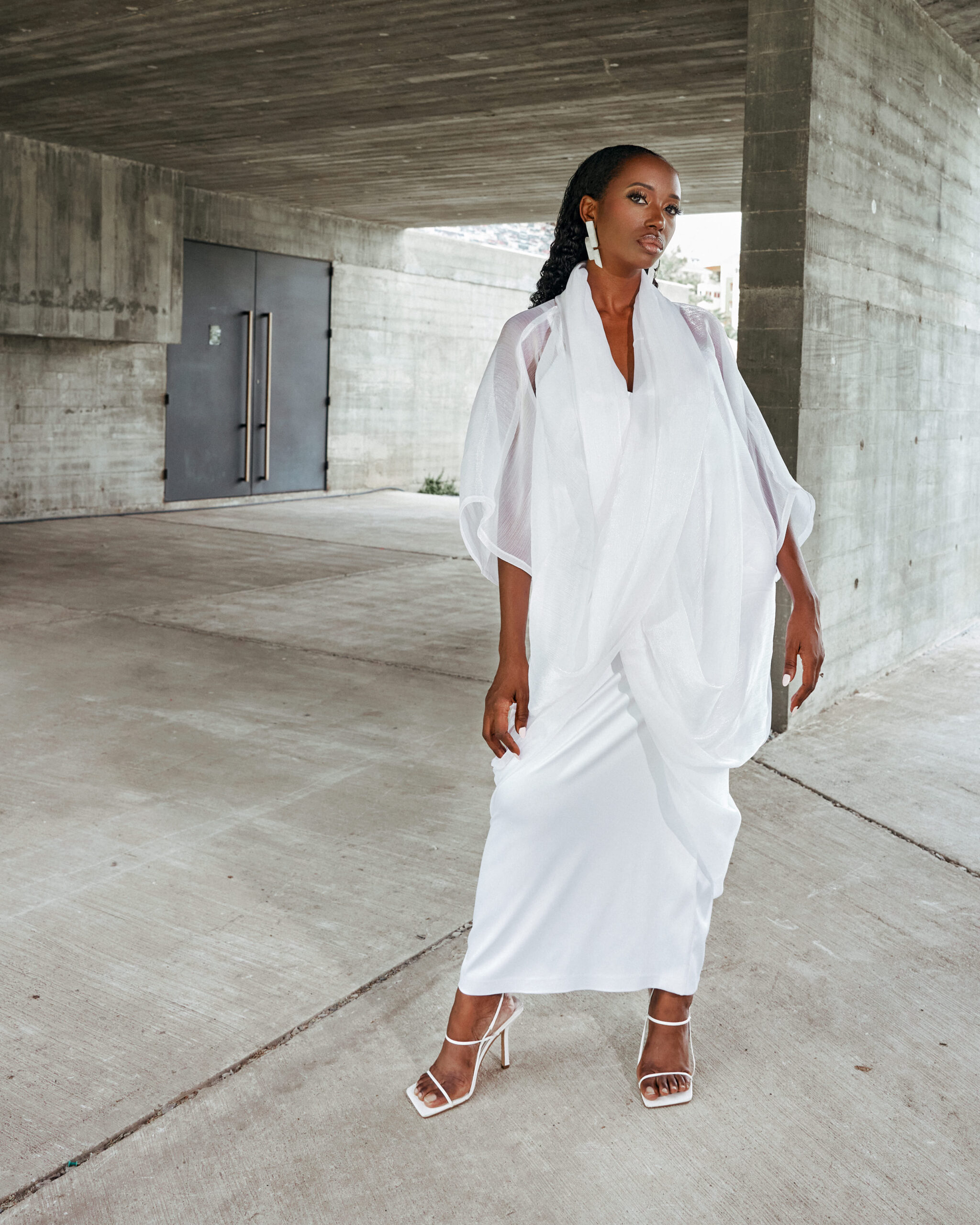 Drapped crosswise the néena dress can be worn as a separate or paired with this pure white satin silk fabric . One thing we know for certain is that , this classy outfit can be manipulated in many ways you will absolutely love.