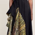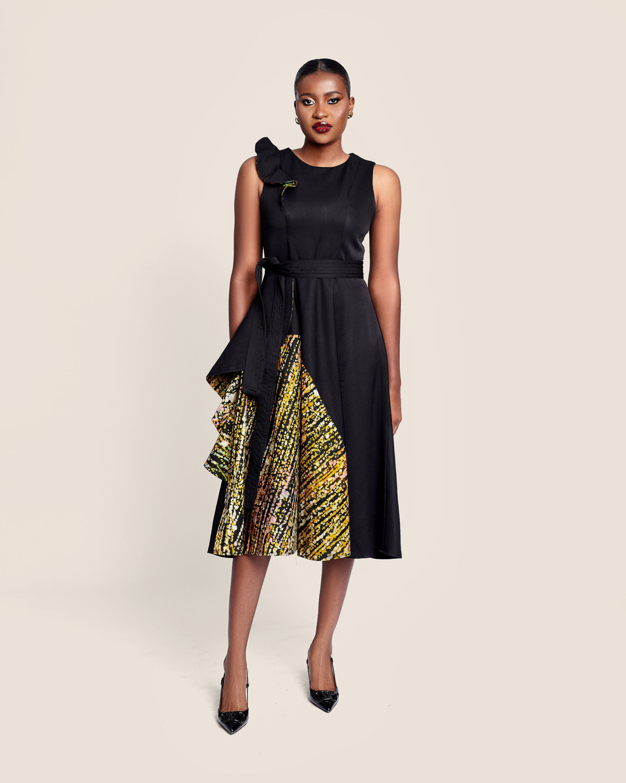 Asymmetric corporate black dress with tye dye ruffle insert .Certainly a bold contrast of prints