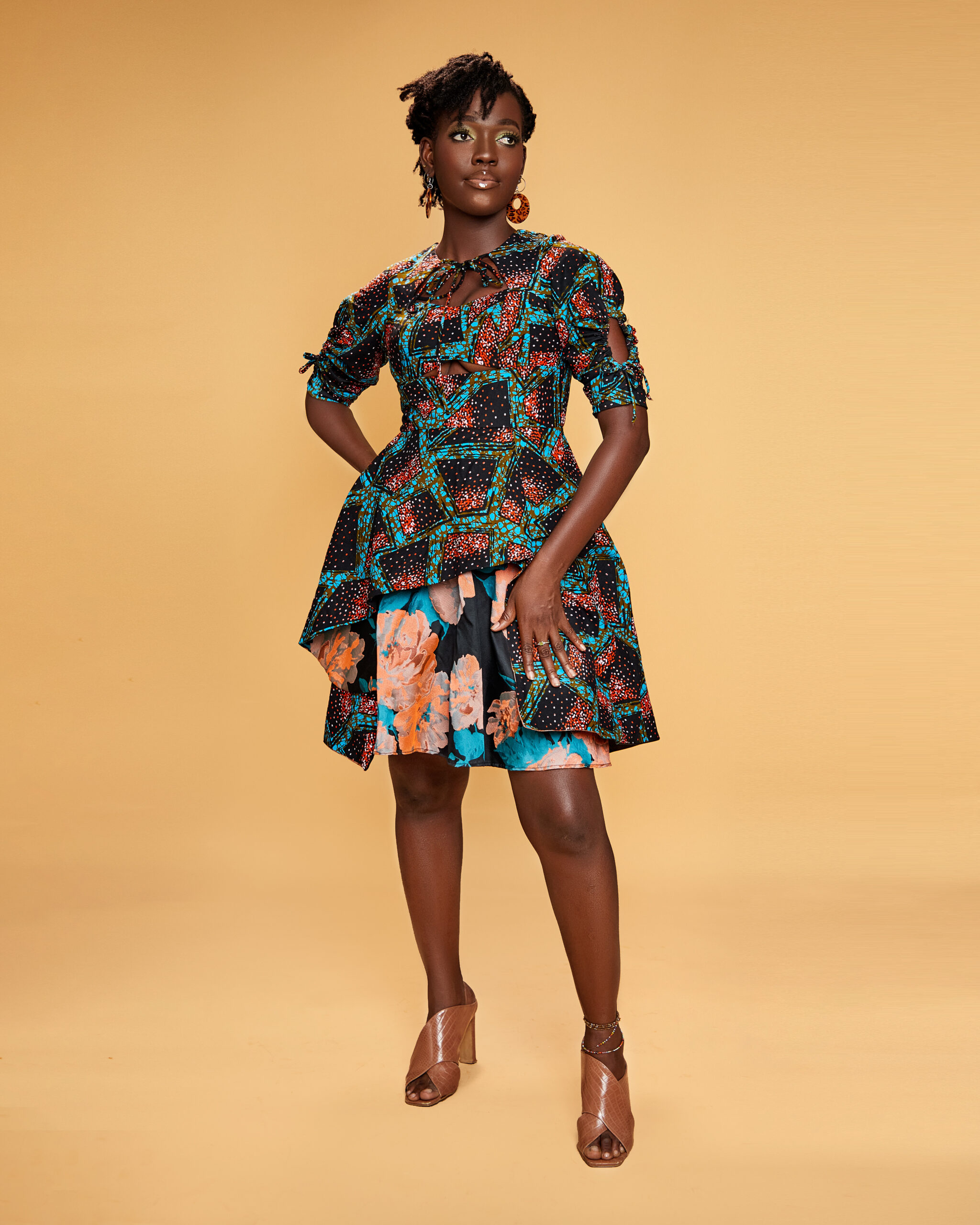 The Zummi dress is an embodiment of precise cutouts , pleats and asymmetric style lines creating an effortless blend of African wax and brocade.