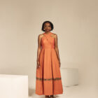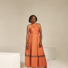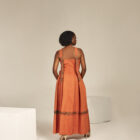 The halter dress features elegant pleats that gracefully cascade down the skirt, creating a flowing and sophisticated look. Delicate peek holes add a touch of subtle allure to the skirt, offering glimpses of the legs. The back is adorned with statement hooks, ensuring a secure and stylish closure.
